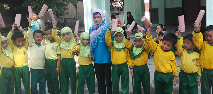 ”Siapa yang tahu ini gambar apa” ”Mobil” ”Berapa jumlah roda mobil?” ”Empat” ”Coba hitung” Dialog di atas